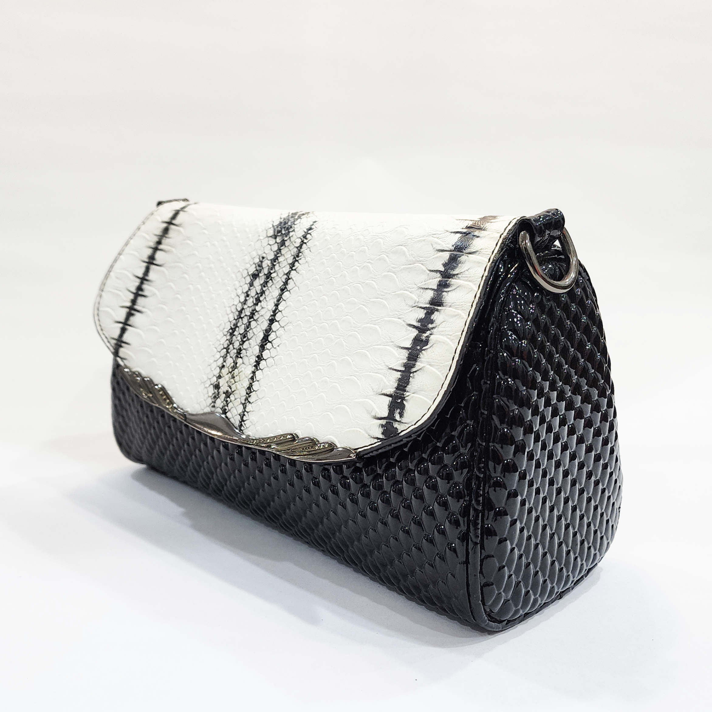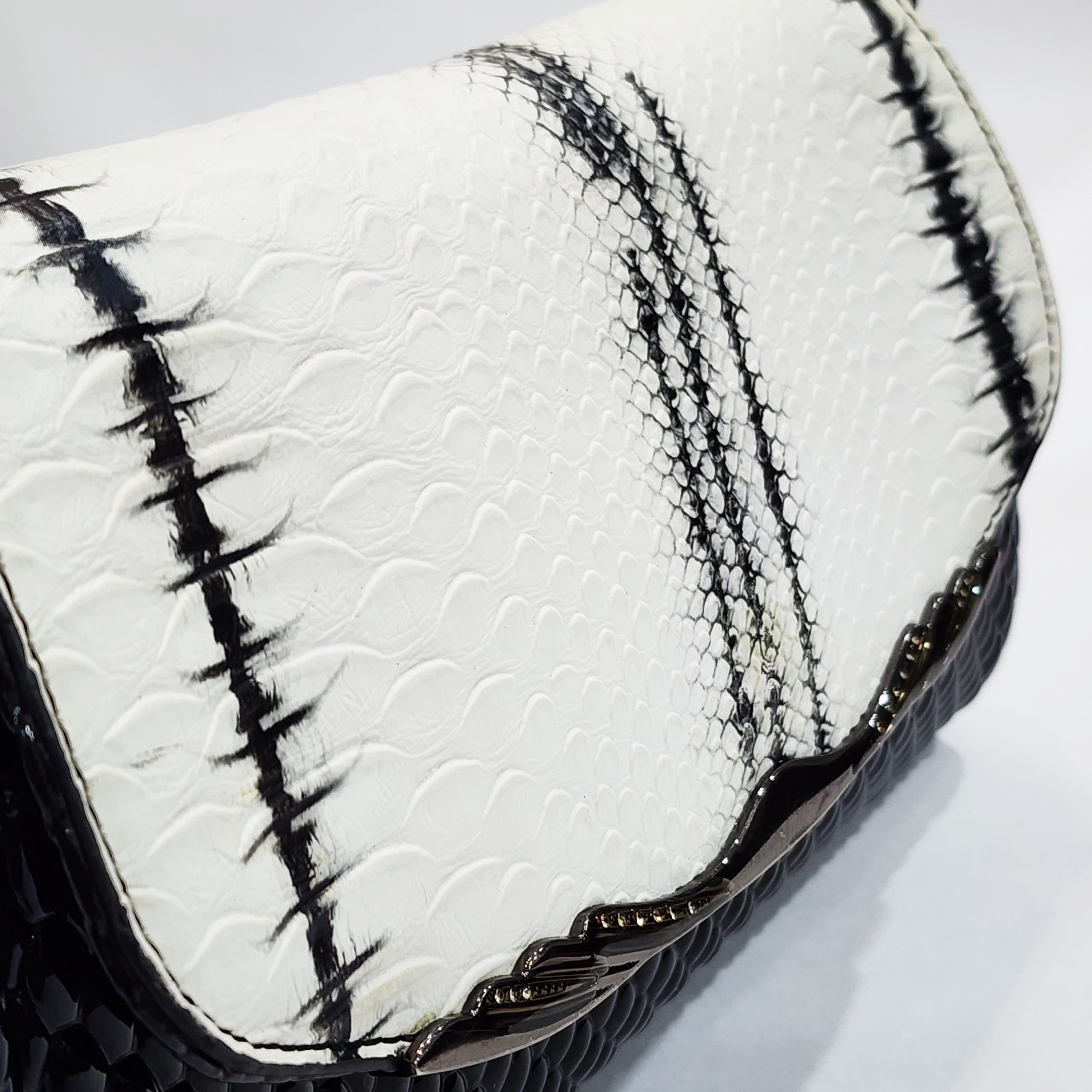 Make a striking, unforgettable statement with this incredibly unique mixed-texture bag. Masterfully contrasting a white faux-snakeskin top flap featuring an edgy black ink-bleed pattern with a highly glossy, 3D bubbled black lower body, this piece is an absolute work of art. Finished with an ornate, crystal-embellished dark metal trim along the flap, it exudes bold, contemporary glamour. Use the convenient side D-rings to attach your favorite strap, or carry it as a captivating oversized clutch to instantly elevate your next evening ensemble.