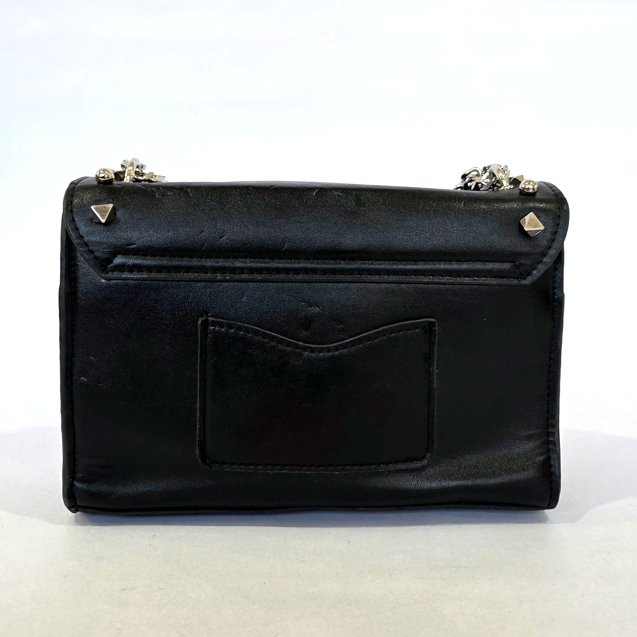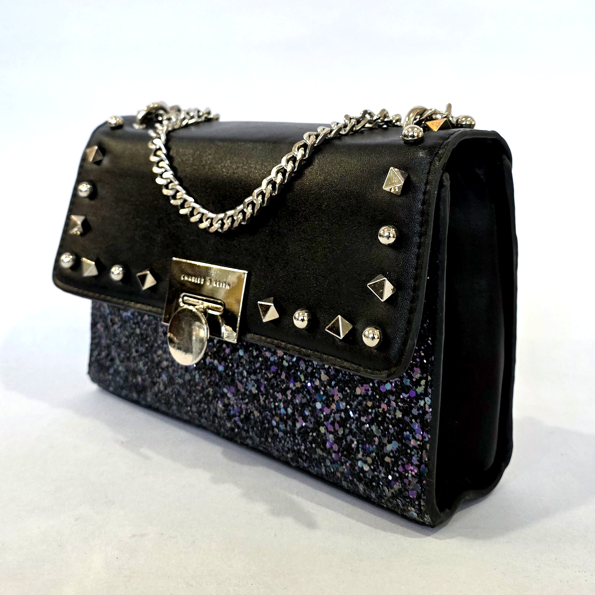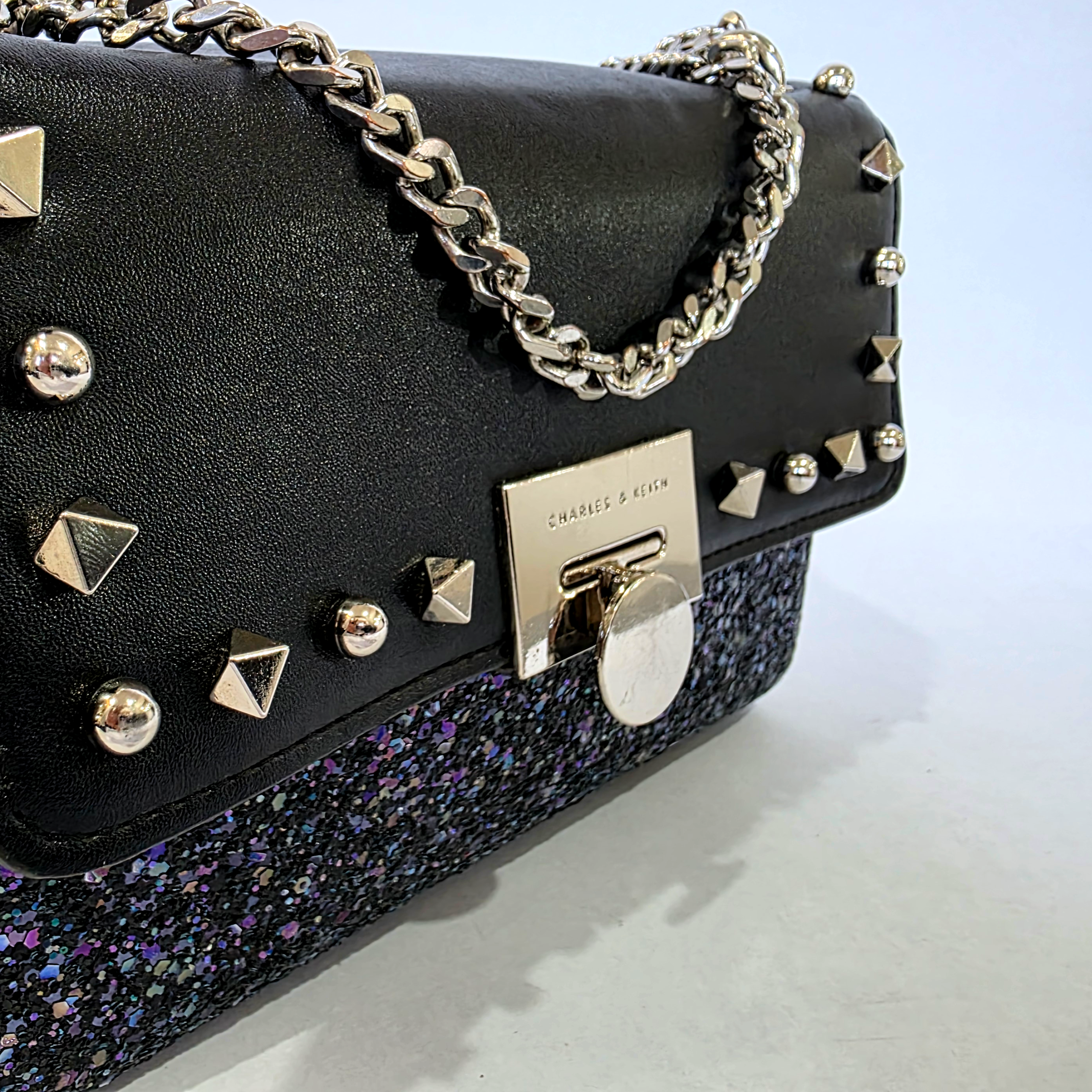 Condition: Fair to Good Pre-Loved. This glamorous bag maintains its firm structure, and the spectacular glitter panel is beautifully intact. As expected with pre-loved smooth materials, the black exterior shows visible signs of wear, including surface indentations, creasing, and light scuffs, particularly across the back panel and the back slip pocket. Additionally, the large silver-tone Charles & Keith front clasp exhibits noticeable surface scratching from regular use (please review the close-up photos carefully). The silver chain and decorative studs remain bright and securely in place.