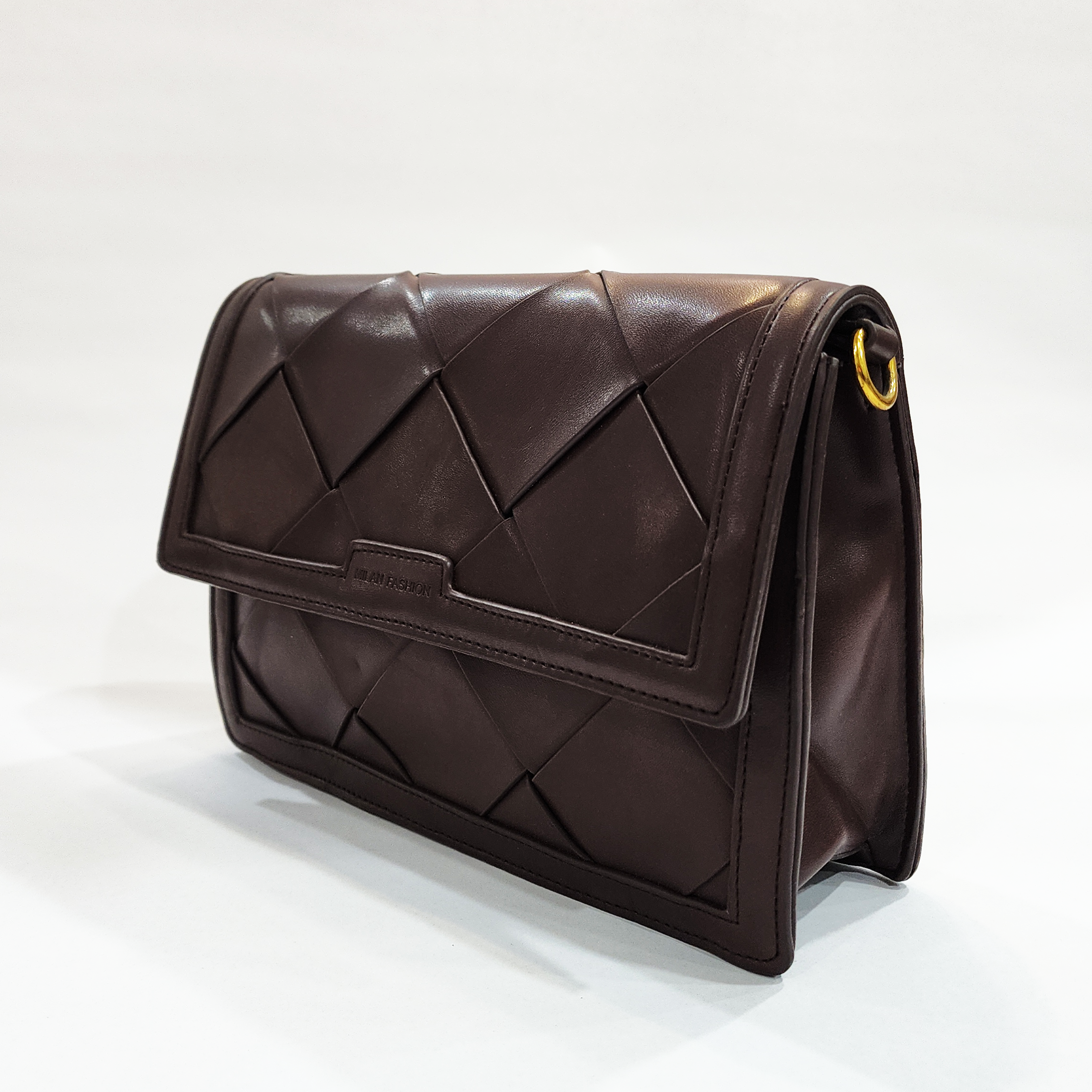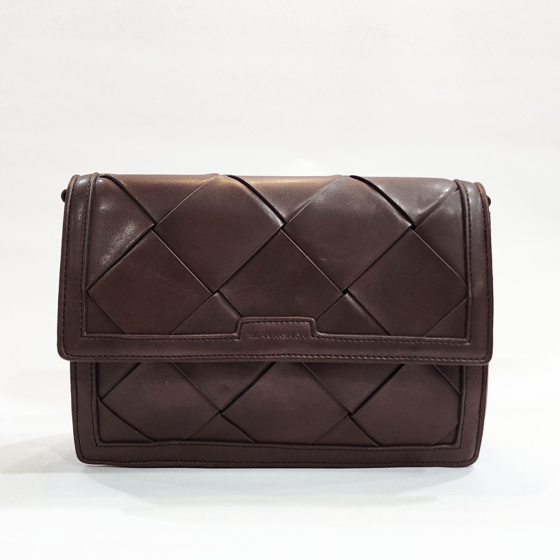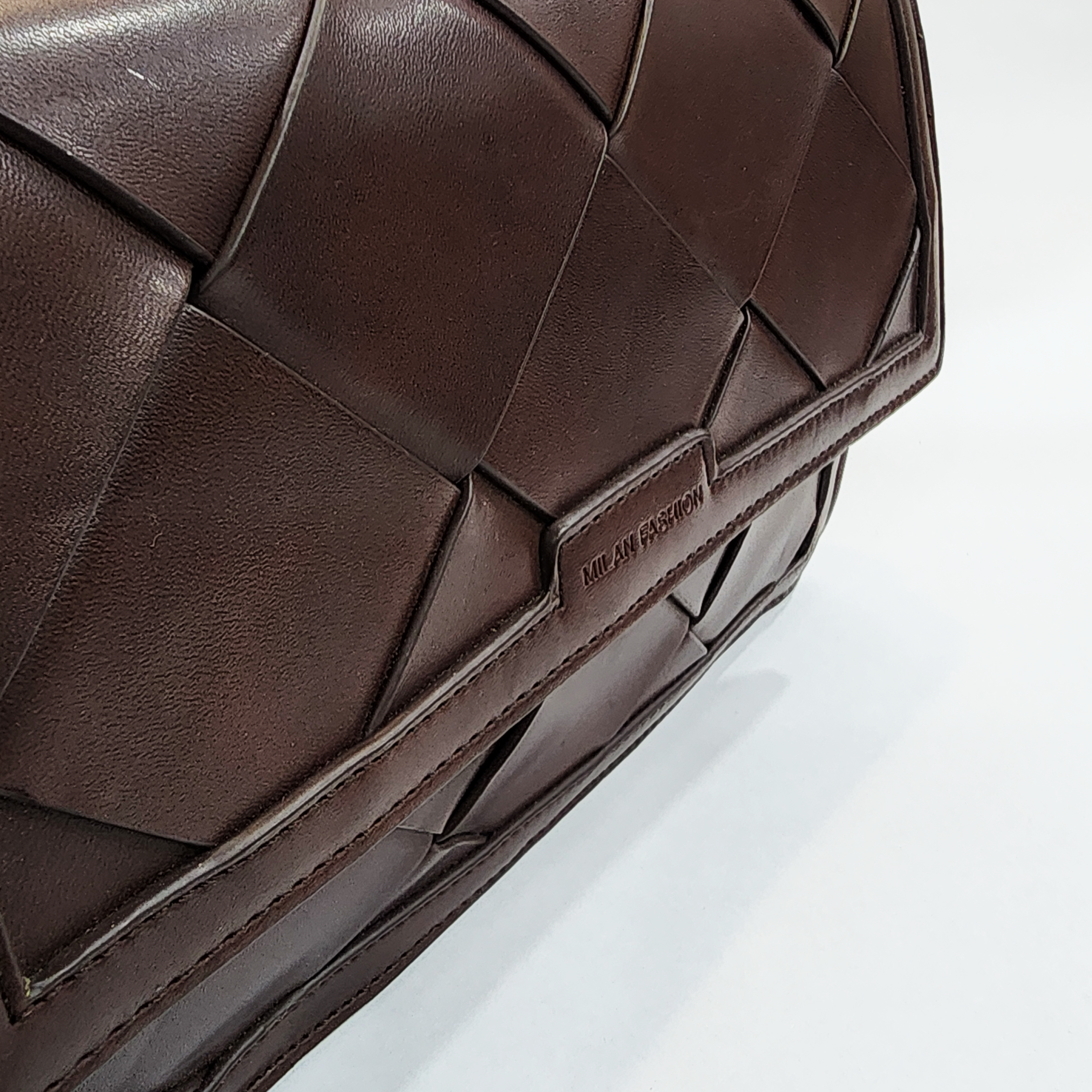 Embrace one of the most coveted contemporary trends with this stunning chocolate brown woven bag. Featuring an eye-catching, oversized braided pattern that is heavily designer-inspired, this piece brings instant high-fashion texture to your everyday wardrobe. Finished with a subtle “MILAN FASHION” embossed detail on the front tab, its sleek profile can be carried as a chic, oversized clutch or easily attached to your favorite strap via the convenient side rings for hands-free wear.