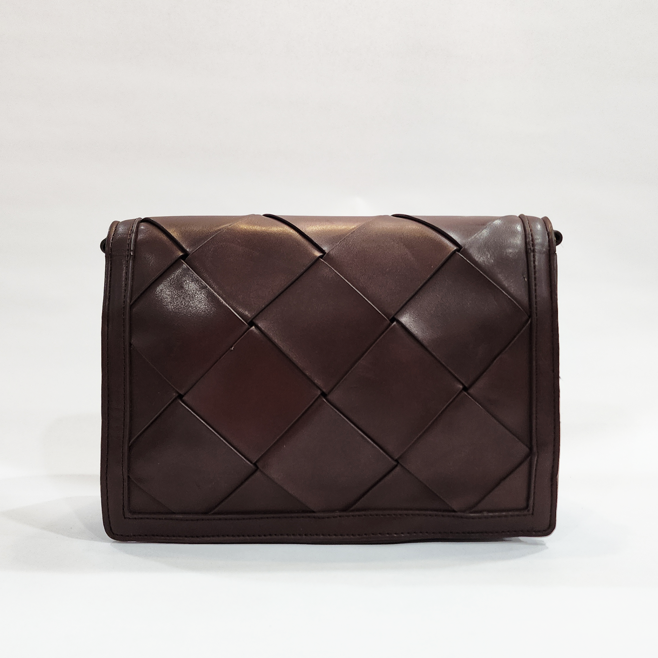 Condition: Very Good Pre-Loved. This bag holds its classic rectangular shape beautifully and the intricate woven pattern remains in fantastic condition. As is typical with very smooth faux-leather finishes, it does show signs of gentle previous wear. You will notice light surface creasing, faint scratches, and minor scuffs across the large woven panels, particularly on the back (please review the photos carefully). Overall, it is highly functional, very clean, and ready to elevate your next outfit.