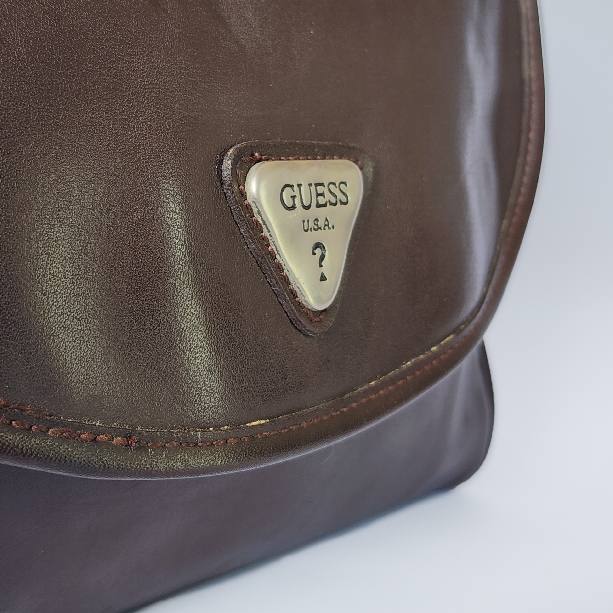 Channel timeless sophistication with this Vintage-Inspired Glossy Leather Flap Bag, featuring a rich chocolate brown faux leather exterior with a high-shine finish that exudes premium quality. The iconic silver-tone triangular logo plaque proudly displays “GUESS U.S.A.” on the curved flap, adding instant brand recognition and retro charm.