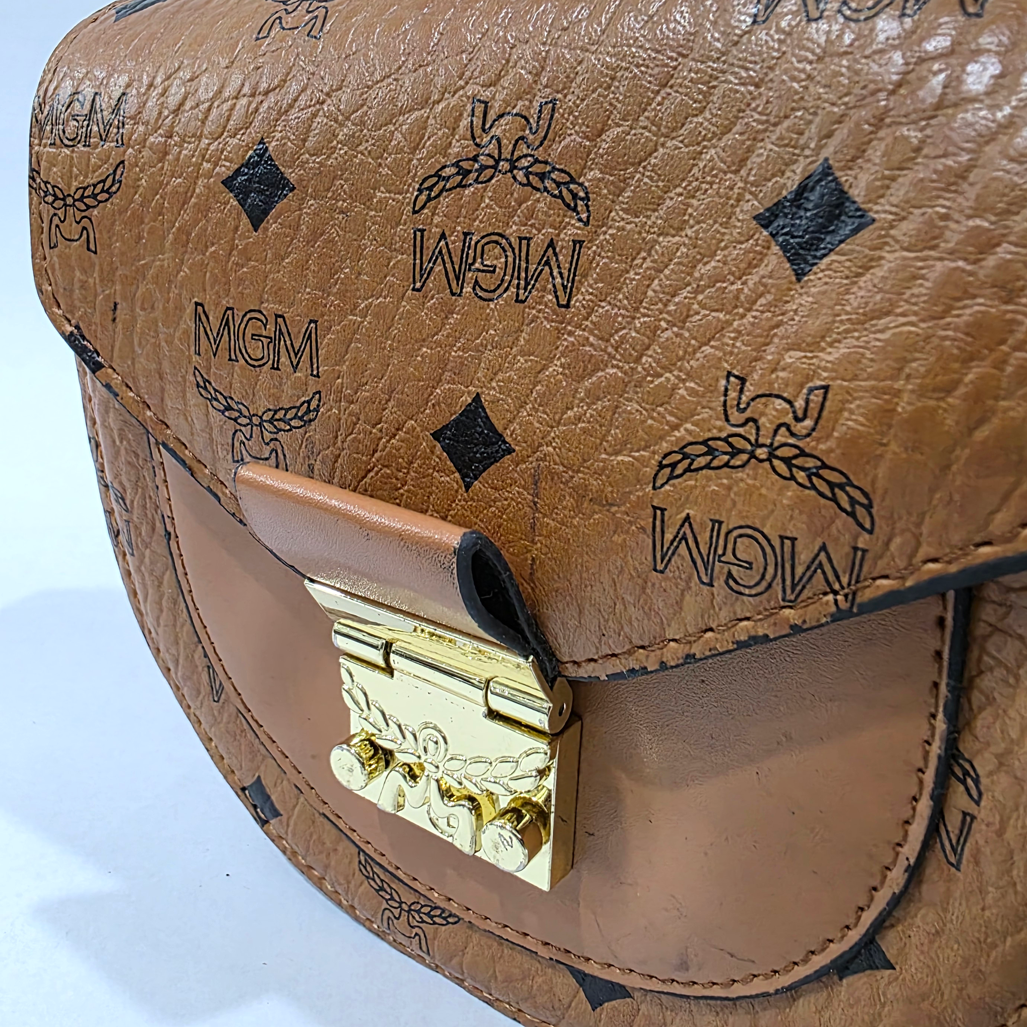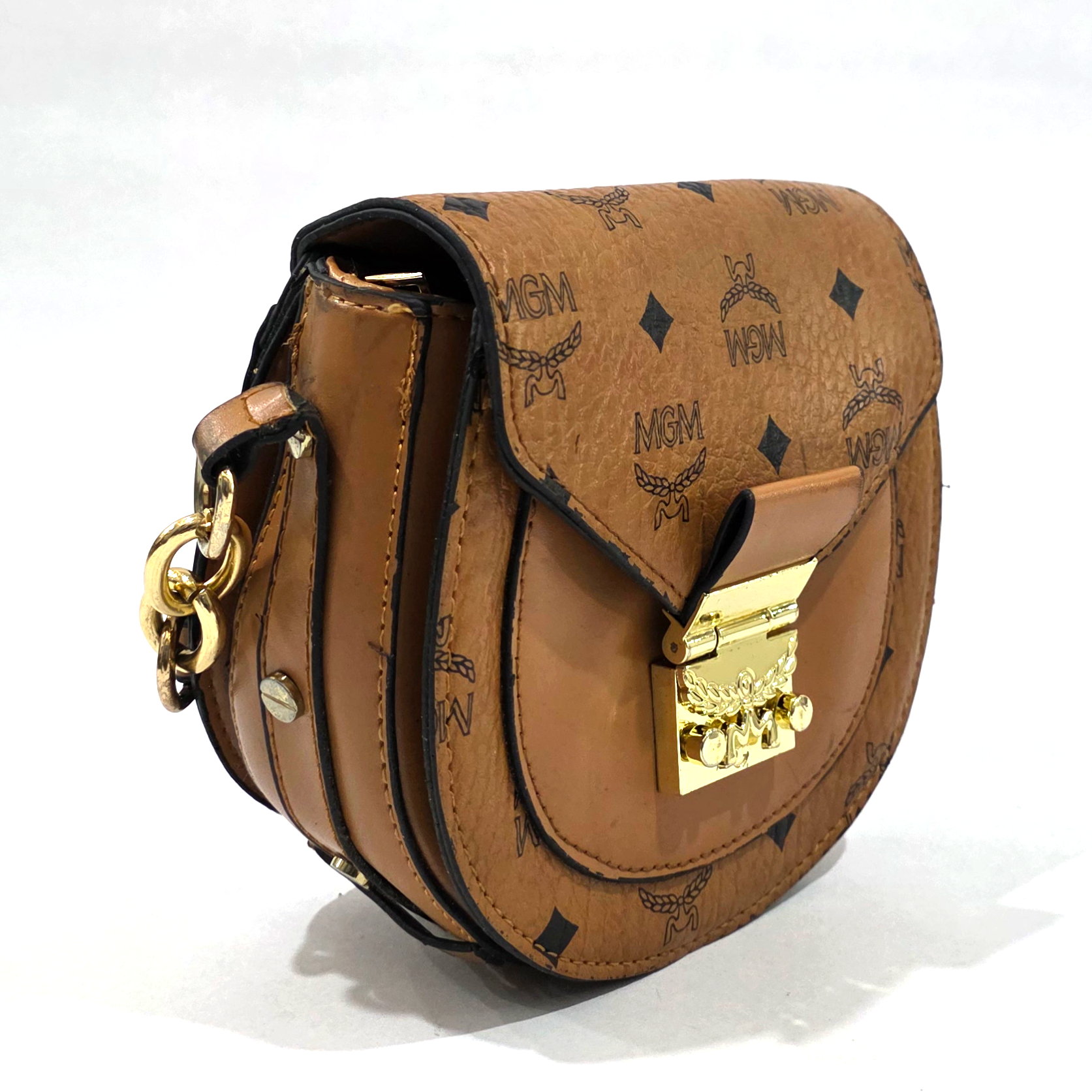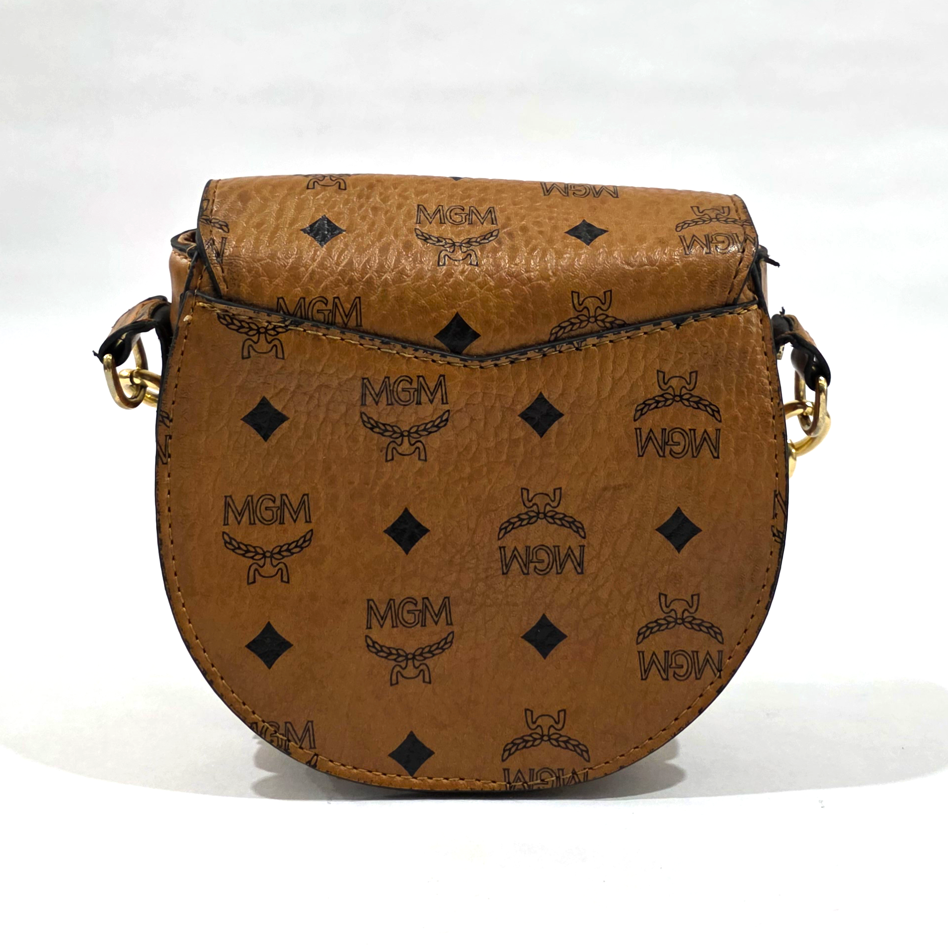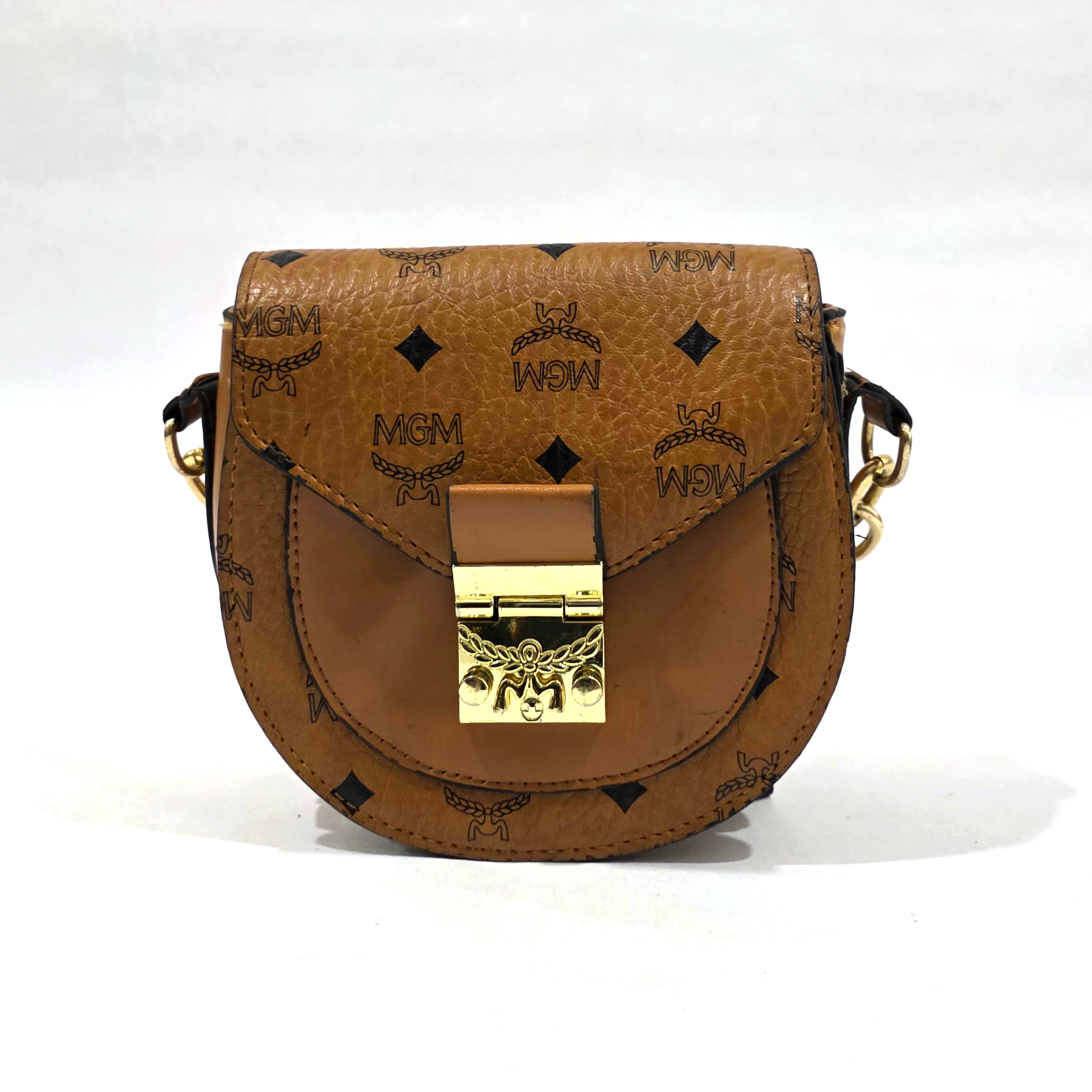 Embrace timeless, vintage-inspired charm with this chic cognac brown saddle bag. Featuring a classic all-over monogram print and a beautifully structured rounded silhouette, this compact piece is perfect for elevating your everyday style. The thoughtful mix of pebbled and smooth textures, paired with an elegant gold-tone push-lock closure, gives this bag a luxurious feel that transitions effortlessly from day to night.