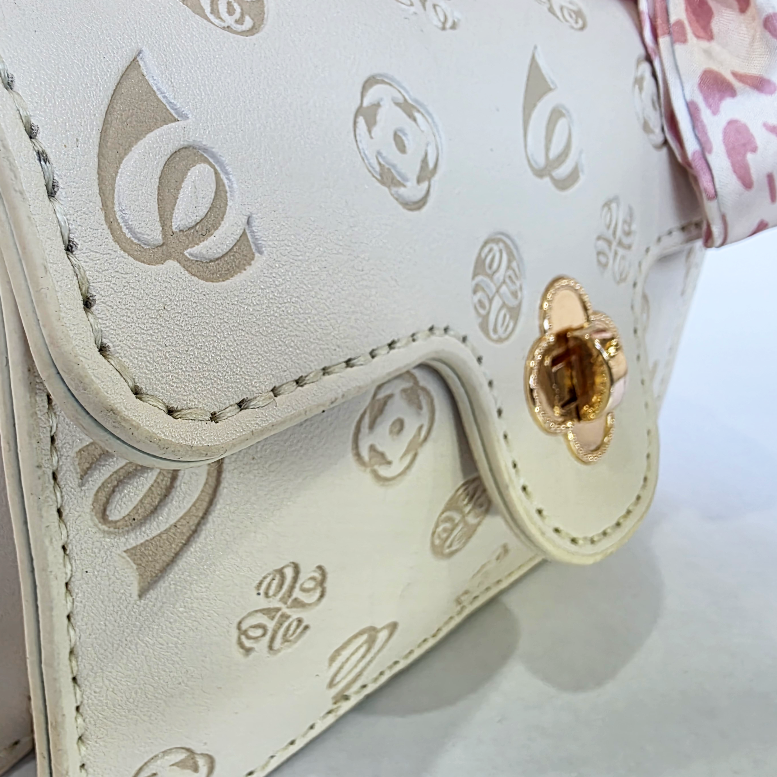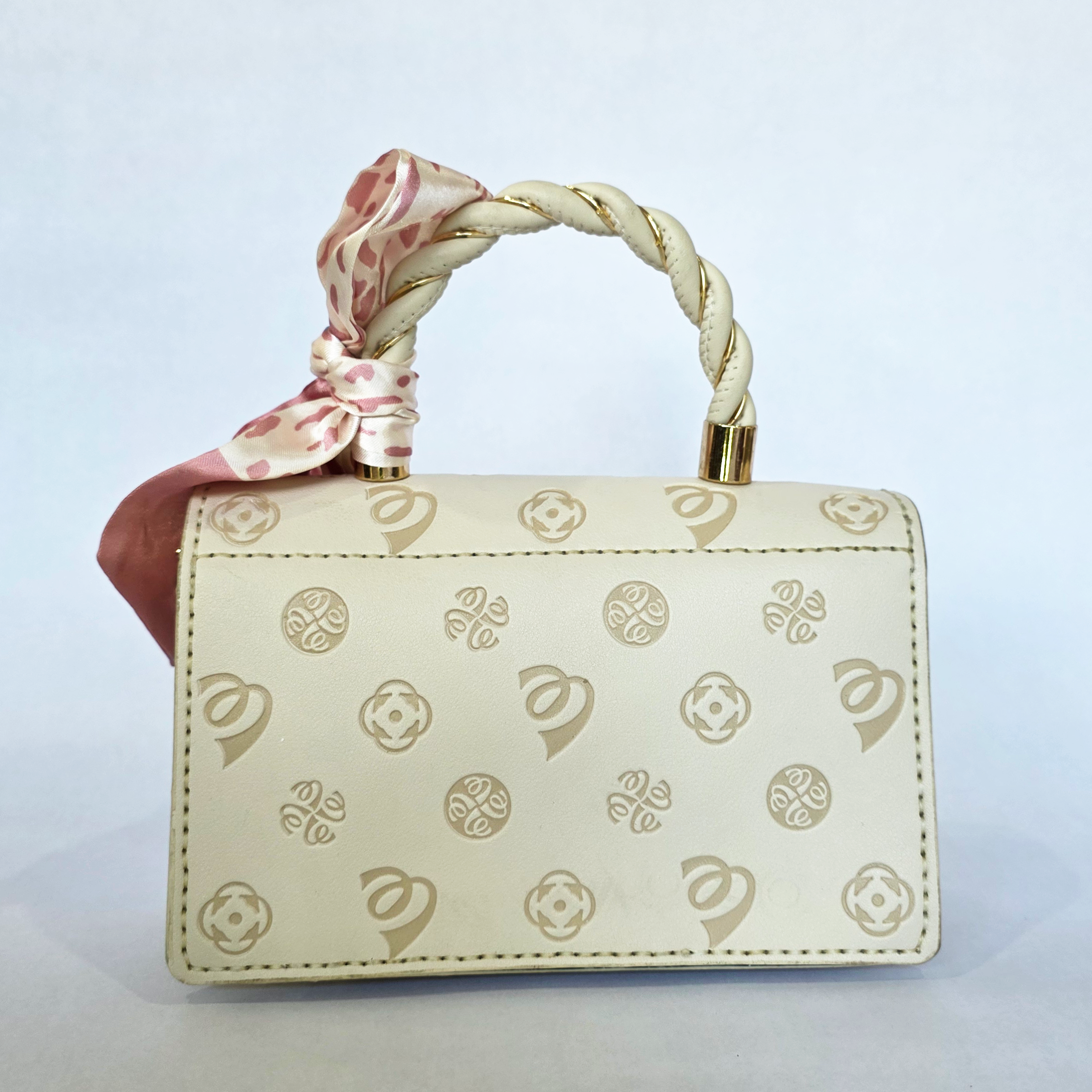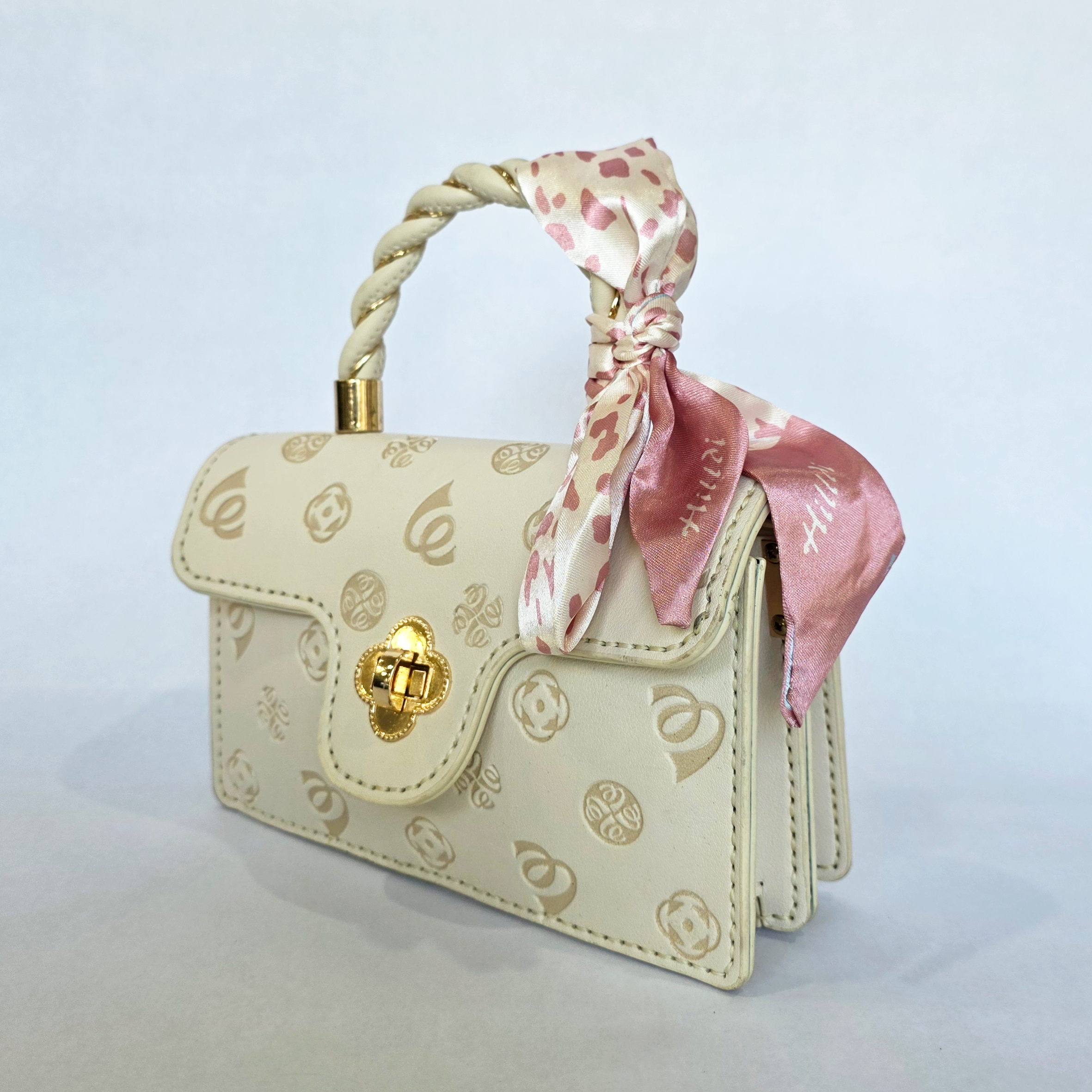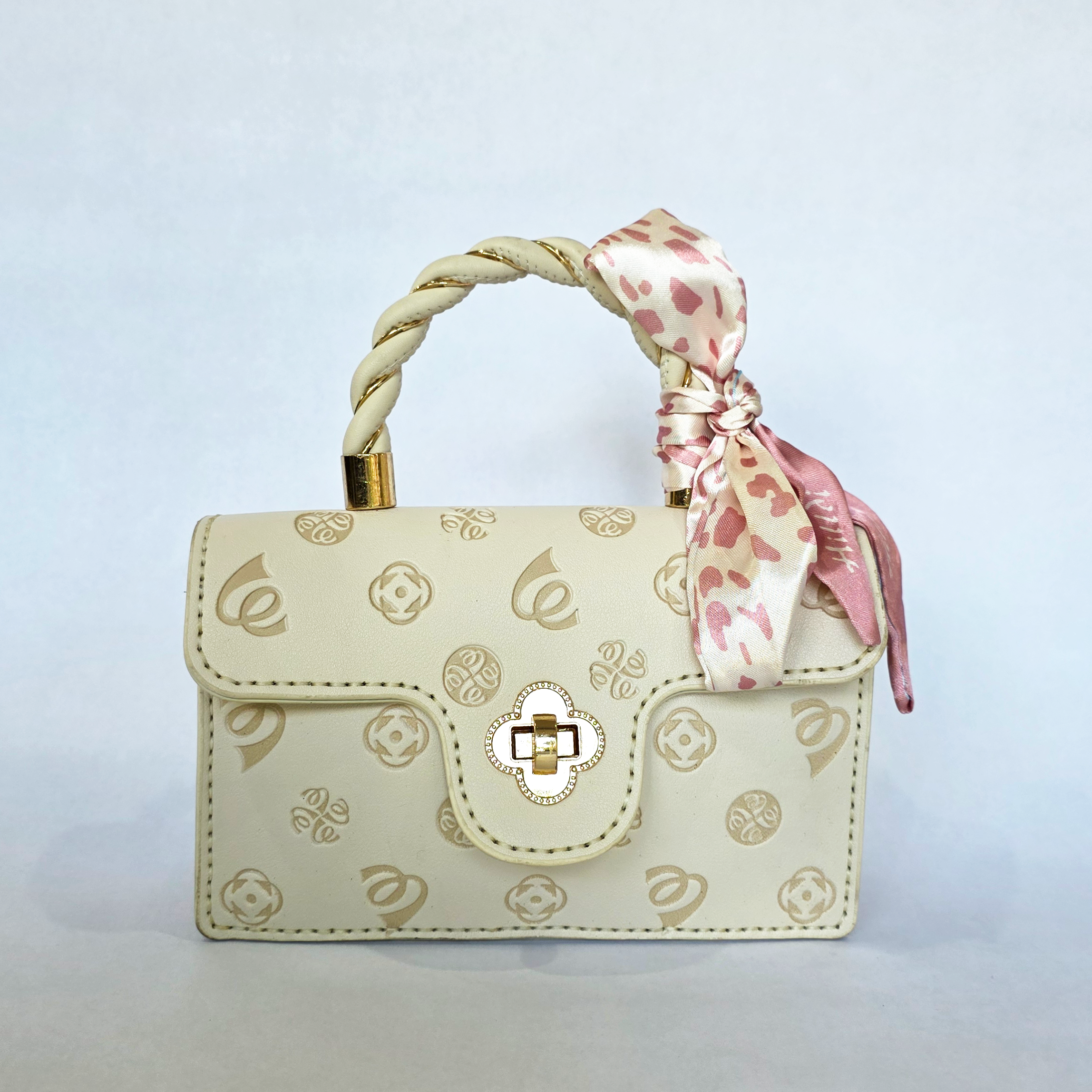 Embrace ultimate feminine elegance with this stunning cream top-handle bag. Featuring a chic all-over embossed pattern and a beautiful gold-tone floral turn-lock closure, this piece feels incredibly luxurious. The true standout is the elegant twisted top handle, beautifully accented with a tied pink patterned silk scarf, adding a soft, sophisticated pop of color to the structured design. With an accordion-style interior to keep your essentials organized, it is the perfect companion for brunch, garden parties, or elevated everyday wear.