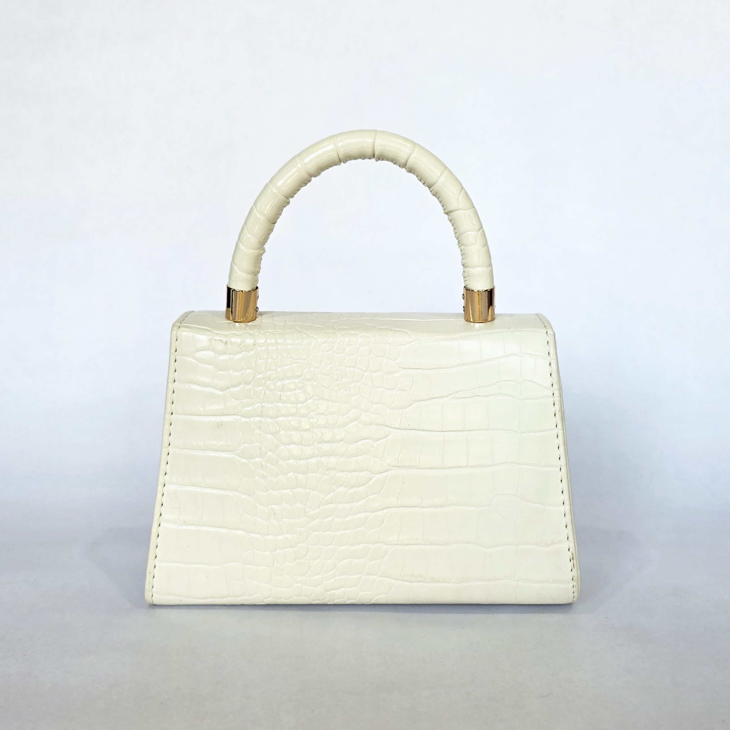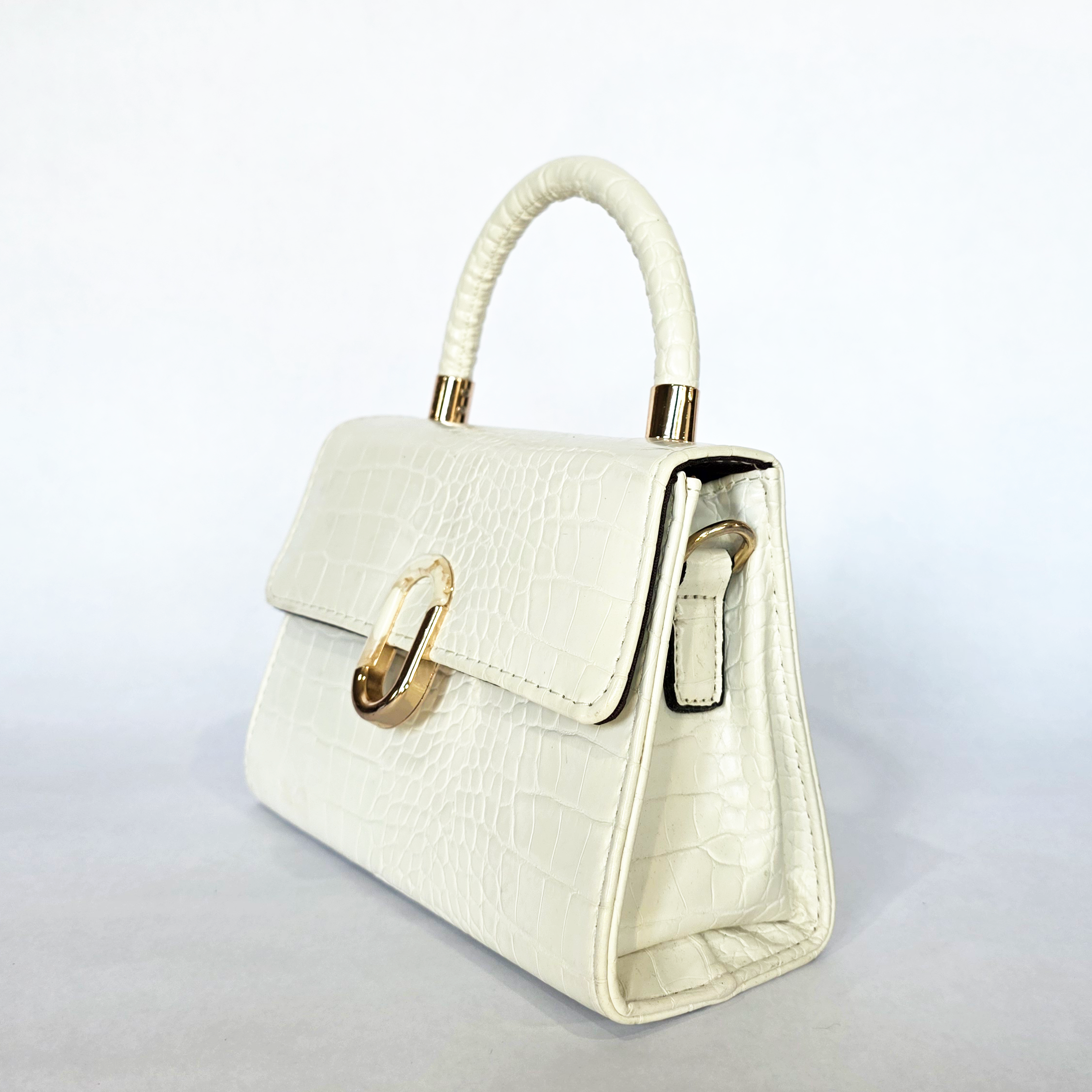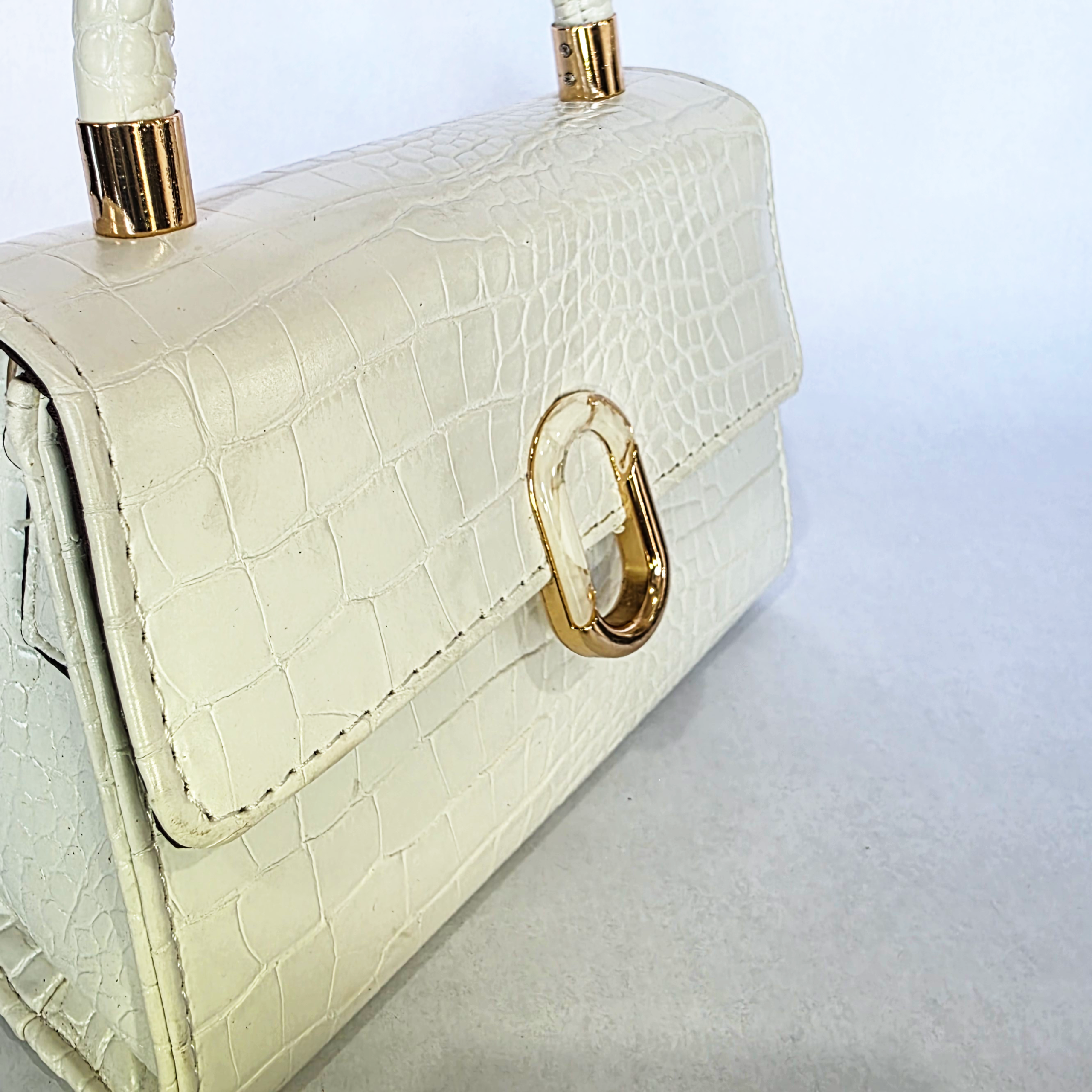 Embrace the chic “mini bag” trend with this elegant cream structured top-handle bag. Featuring a sophisticated mock-crocodile embossed texture and a stunning gold-tone and cream resin statement clasp, this piece brings instant polish to any outfit. Carry it gracefully by the sturdy rolled top handle for a classic look, or use the convenient side rings to clip on your favorite strap for hands-free versatility.
