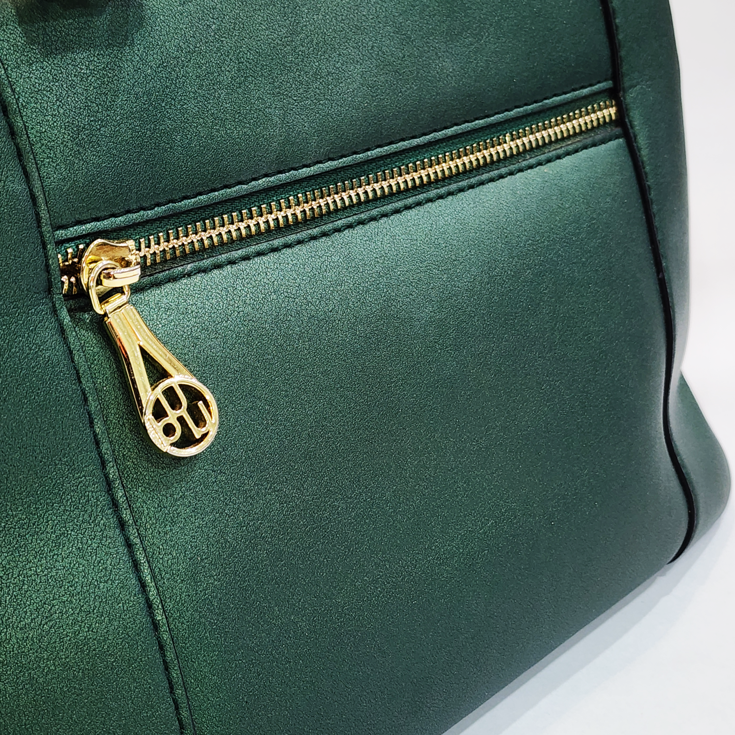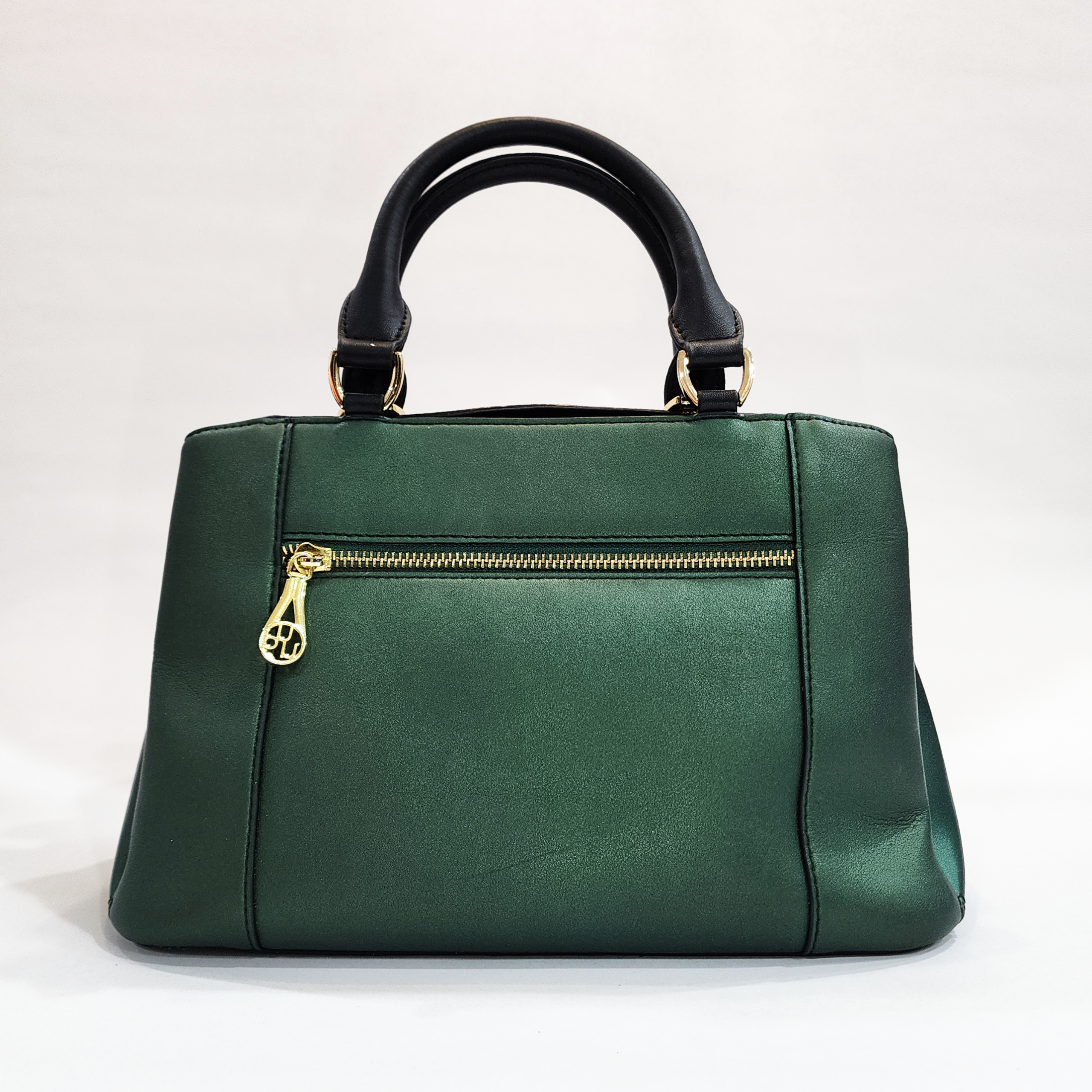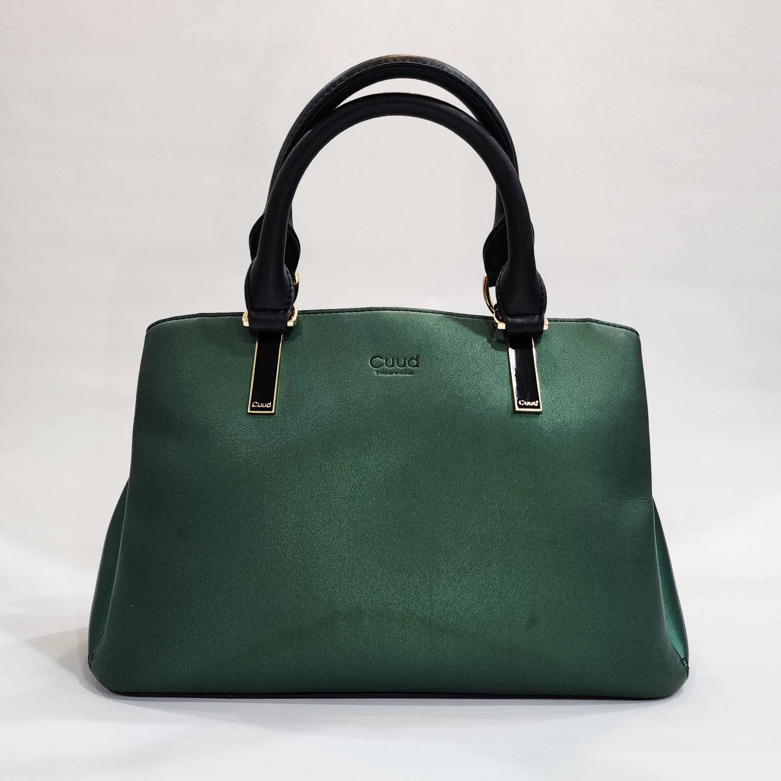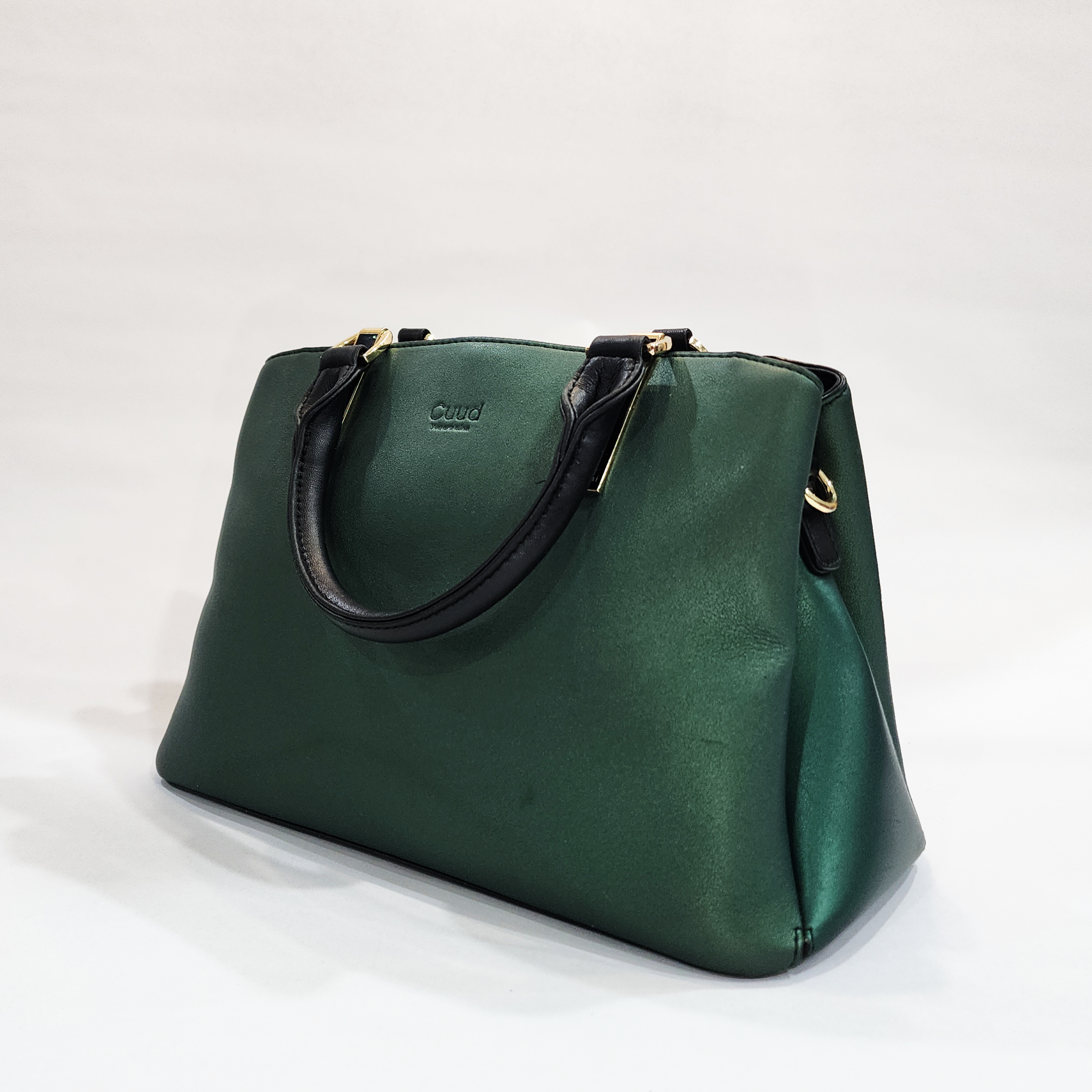 Add a sophisticated pop of color to your everyday wardrobe with this stunning emerald green satchel from Cuud. Featuring a unique, subtly metallic pearlized finish that catches the light beautifully, it is elegantly contrasted by sturdy black rolled top handles. The structured, roomy trapezoid silhouette easily holds all your daily essentials, while the convenient back zip pocket—complete with a striking custom gold-tone charm—keeps your quick-access items completely secure. Carry it classic by the handles, or attach your favorite crossbody strap to the convenient side rings for hands-free wear.
