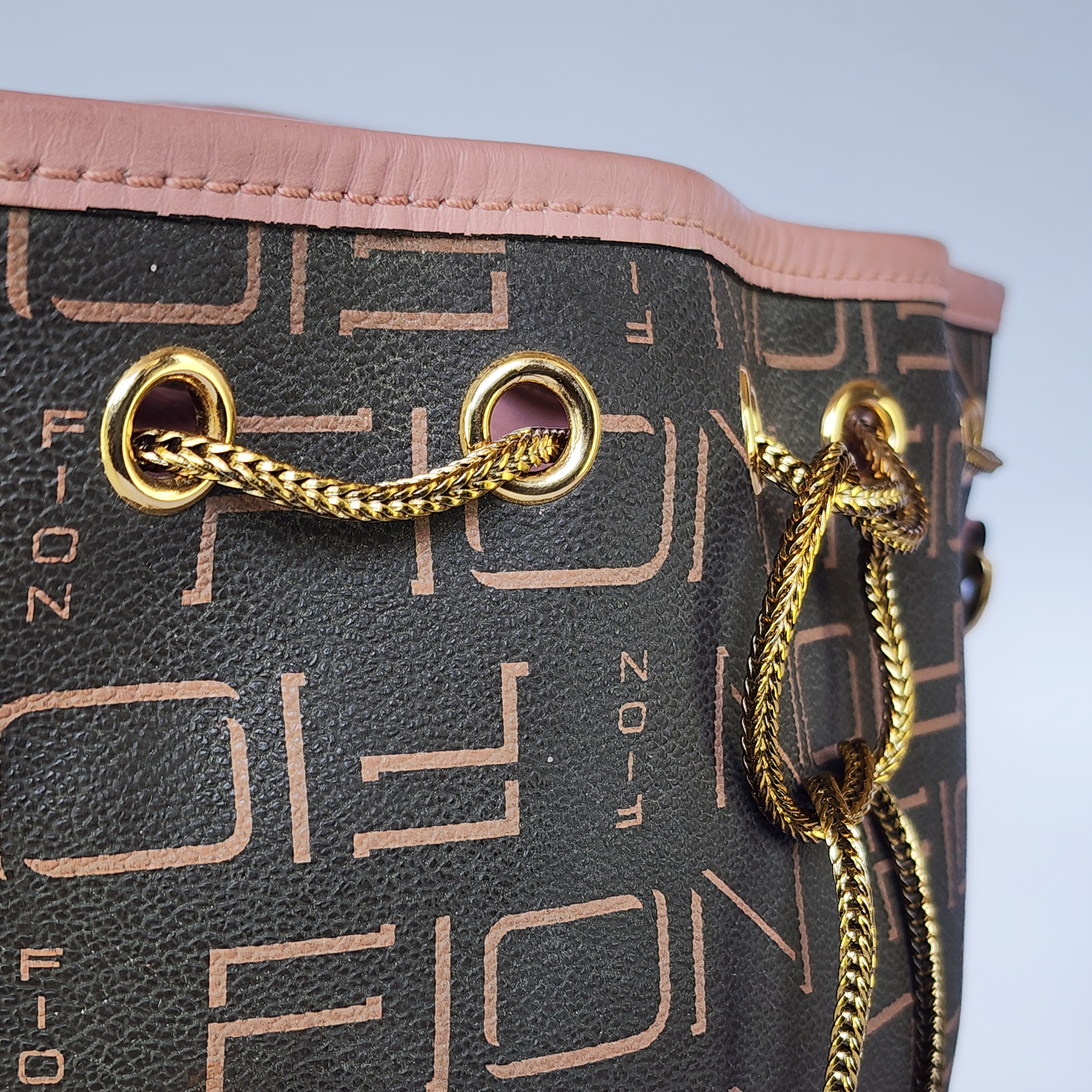 This eye-catching pre-loved FION bucket bag combines bold style with everyday practicality. The deep olive green faux leather is covered in a repeating metallic gold FION logo pattern, giving it instant designer appeal. The luxurious gold braided drawstring closure, pink leather trim, and gold hardware accents make this piece feel elevated and playful. Perfect for casual outings or adding a touch of glamour to your look – in excellent gently used condition.