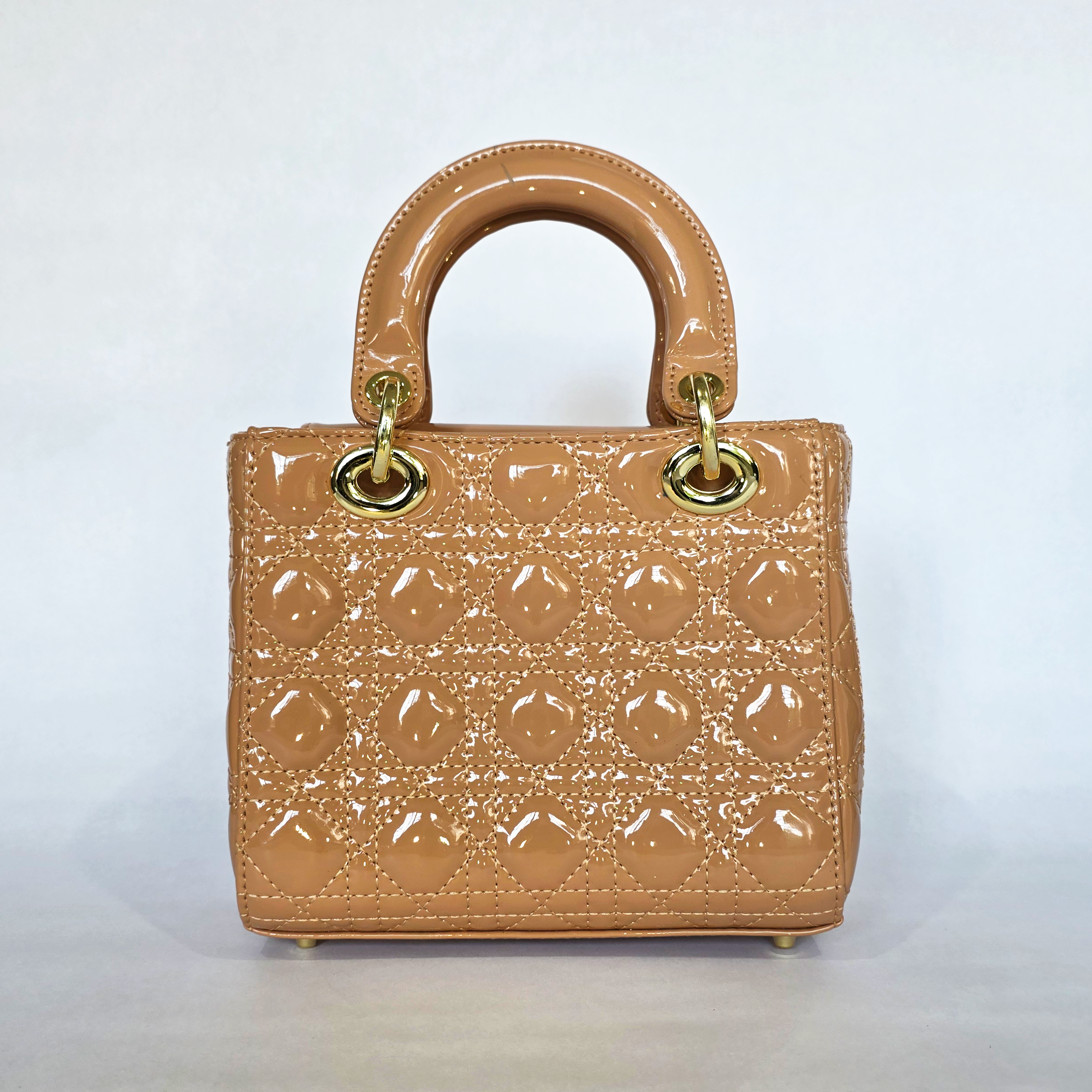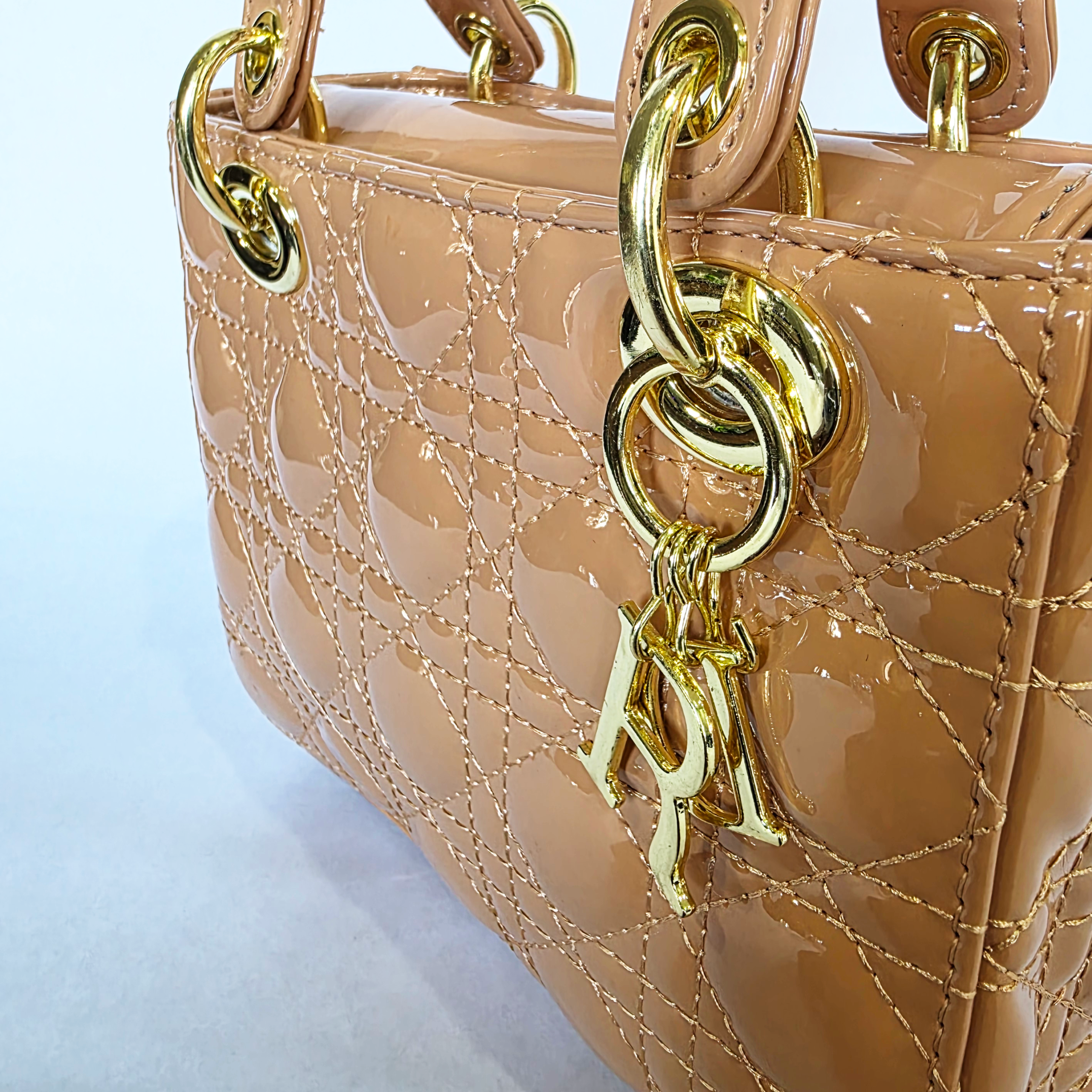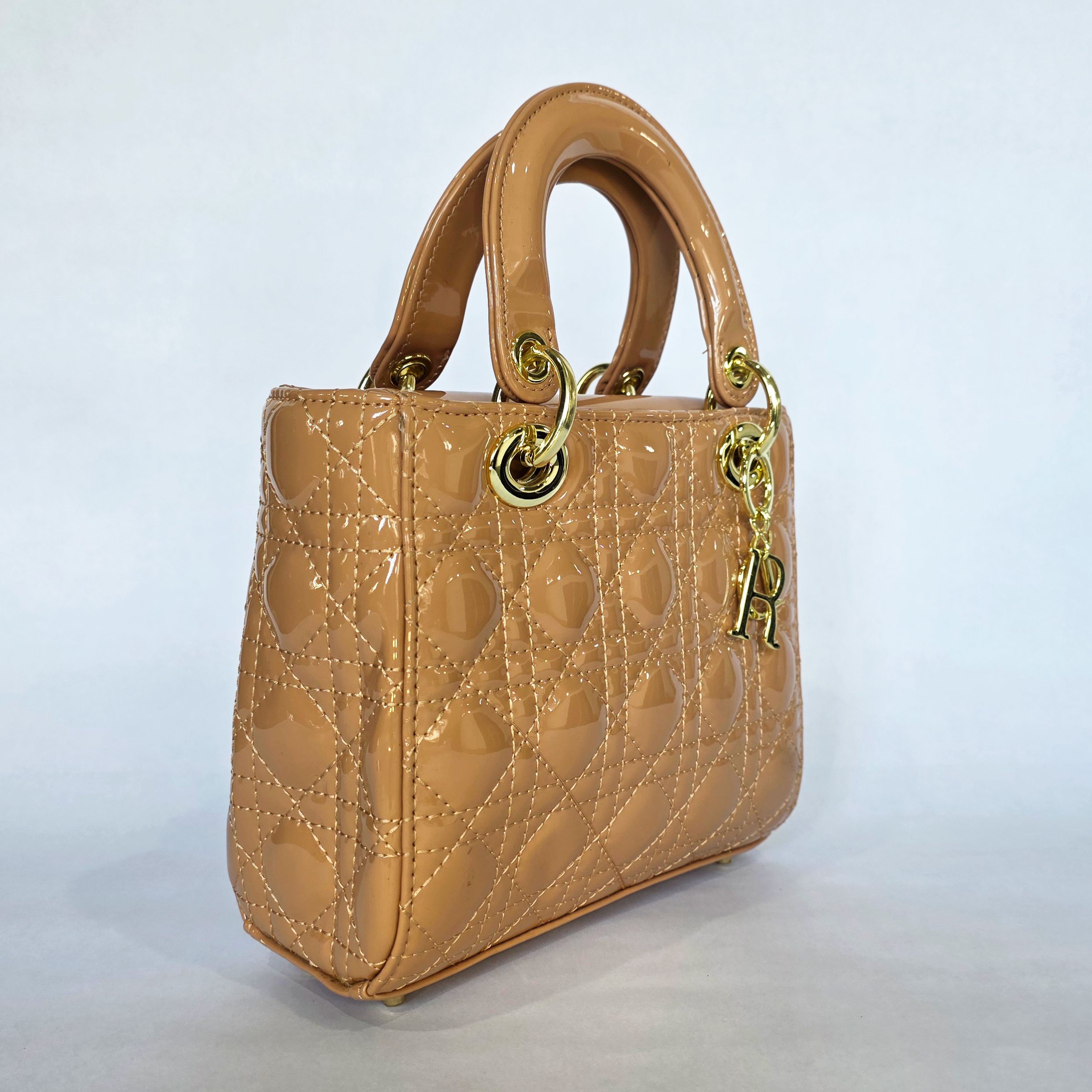 Channel timeless, high-end glamour with this spectacular designer-inspired top-handle bag. Featuring a classic geometric quilted pattern on a glossy nude patent exterior, this structured piece exudes sophisticated elegance. Finished with sturdy rolled handles, protective base feet, and a playful gold-tone ‘R’ hanging charm, it is the ultimate statement accessory to elevate your brunch dates, high teas, or evening events.