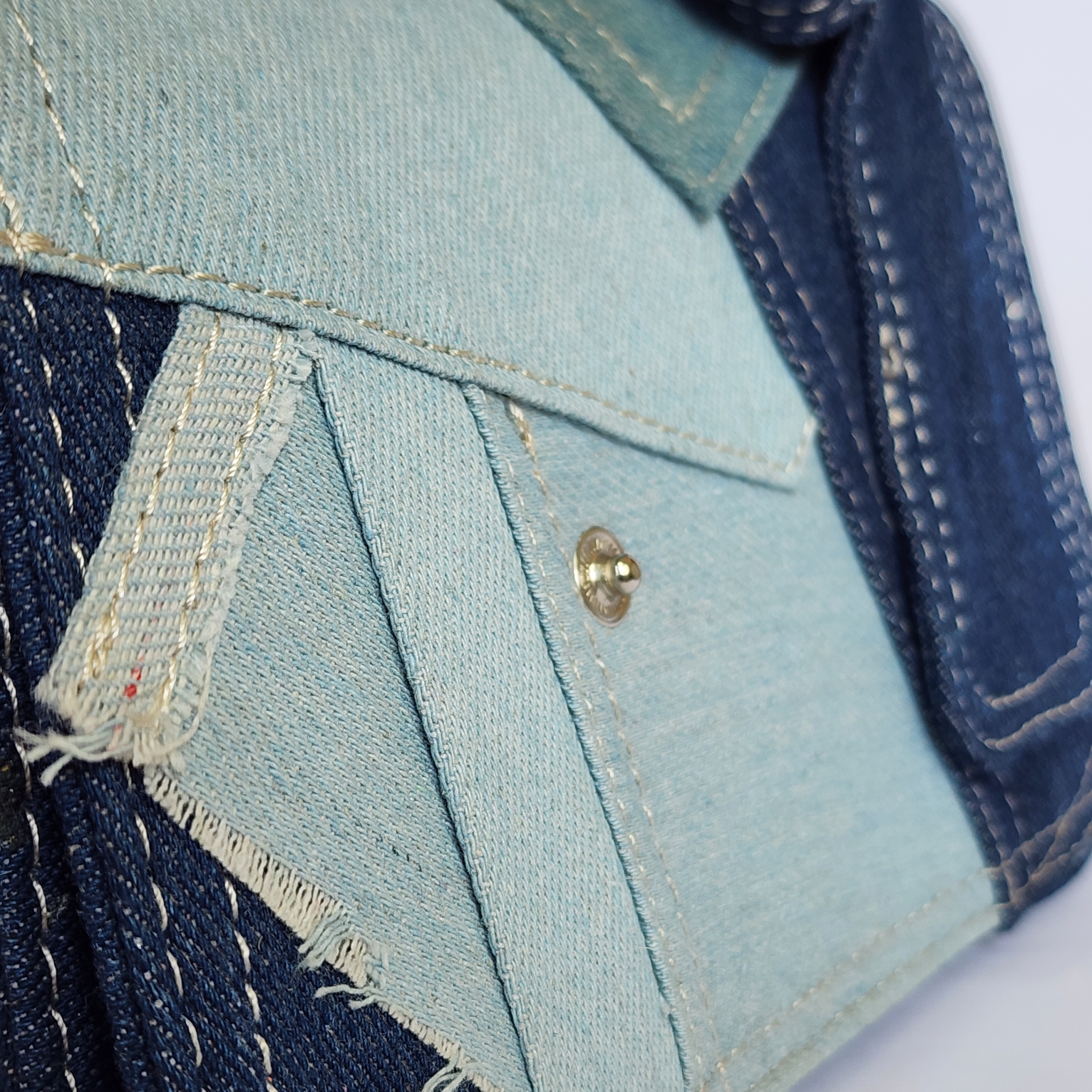 Give your denim-on-denim look a serious upgrade. This isn’t just a bag; it’s a statement. Featuring a high-contrast patchwork design of light and dark-wash denim, this mini bag blends rugged streetwear vibes with a chic, structured silhouette. The standout knotted handle adds a playful touch to the raw, distressed edges and vintage-inspired hardware.