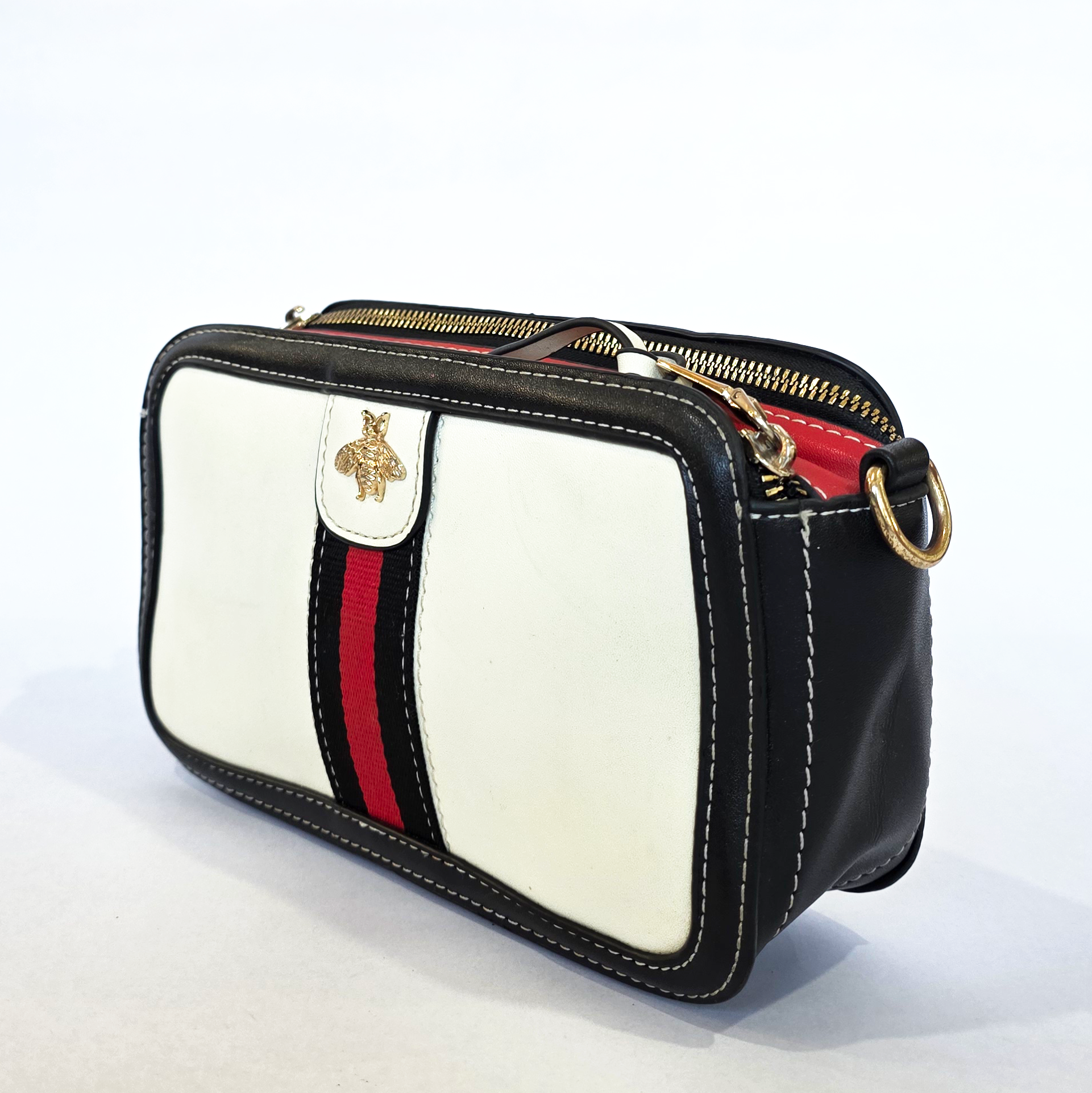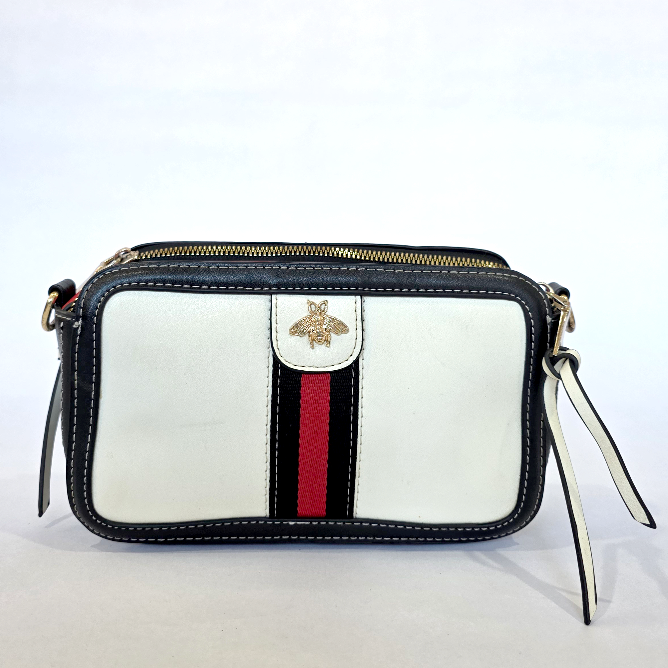 Elevate your everyday style with this striking luxury-inspired camera bag. Featuring a crisp white body framed by contrasting black trim, a bold red-and-black center stripe, and a signature gold-tone metallic bee embellishment, this piece offers high-end designer aesthetics at an accessible price. The structured, zip-top silhouette makes it the ultimate chic and secure companion for carrying your daily essentials, easily transitioning from casual daytime coffee runs to stylish weekend events.
