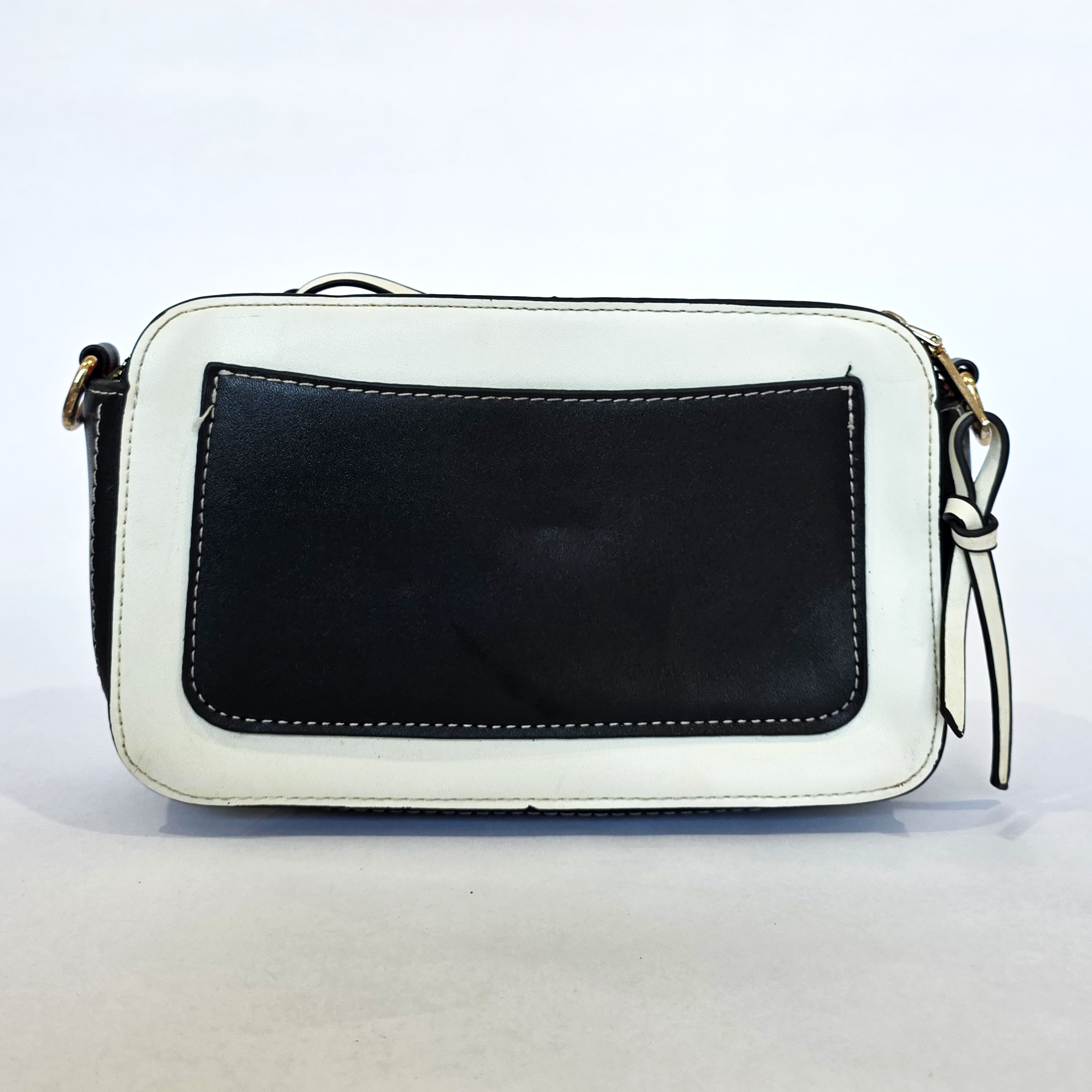 Condition: Good Pre-Loved. This bag holds its classic structured shape perfectly, and the striking contrast stitching remains wonderfully intact. The statement gold-tone bee hardware and top zipper remain bright and fully functional. As is common with light-colored faux-leather exteriors, it does show visible signs of previous use, including faint scuffs and light surface marks on the white front panels (please review the close-up photos carefully). The contrasting black back panel is in fantastic shape, making this a beautiful, highly wearable statement piece.